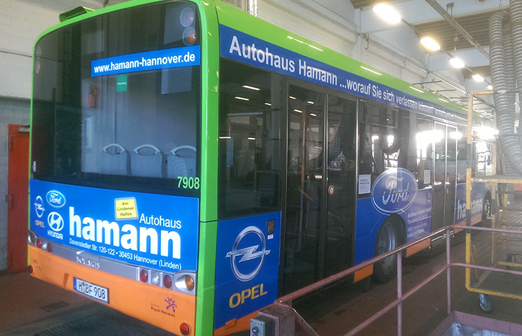 Für das Autohaus Hamann gestalteten wir Beschriftungen mehrerer hannoverscher Linienbusse, was weiter zur Festigung des Rufes des Autohauses in der Öffentlichkeit und die kontinuierliche Steigerung des Bekanntheitsgrades und letztendlich auch für eine gute Rendite sorgt.